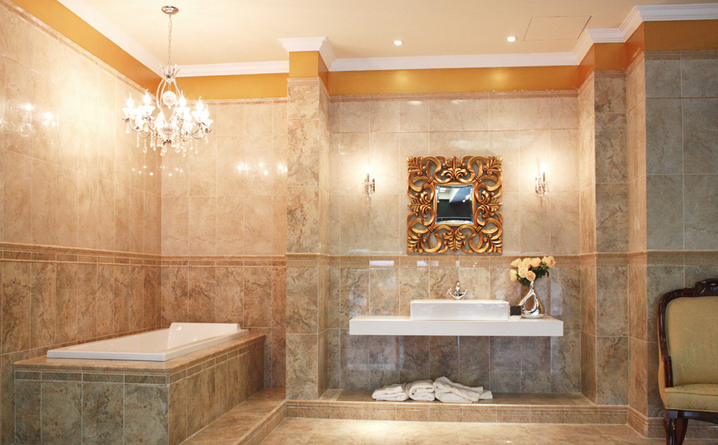 通體磚是將巖石碎屑高壓壓制而成,表面不上釉,正反面色澤一致。通體磚表面比較粗糙,因而防滑性能比較好。目前市場上的防滑磚大多屬于通體磚。