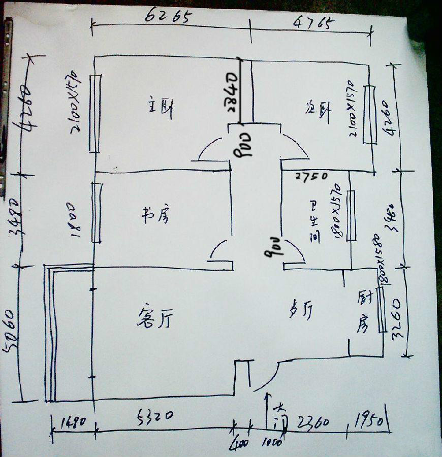 3、用卷尺將草圖上的每一筆代表的長度均測量準確,用筆在旁邊標注,建議以厘米作單位(專業人士以毫米做單位,個人認為不必非要那么專業)。