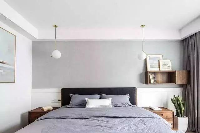 主臥的背景墻設(shè)計(jì)的很有格調(diào),上墻刷灰色墻漆,下墻是白色護(hù)墻板,既有個(gè)性又美觀。主臥裝了吊燈和射燈照明,滿(mǎn)足不同區(qū)域的光照需求。灰色調(diào)的床品,多了一些低調(diào)素雅。