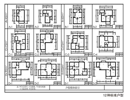 由于福州的拆遷安置房普遍采用45㎡、60㎡、75㎡、90㎡、105㎡等建筑面積區(qū)分,本圖集就針對這五類建筑面積設計了12種標準戶型,經(jīng)過組合形成7個樓層戶型組合平面圖。此外,圖集同時推出了三個廚房及衛(wèi)生間標準模塊,可適應不同標準戶型的選擇需要。