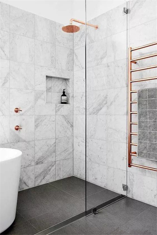 為此,小編建議如果實(shí)在喜歡長條形地漏的顏值,在干區(qū)安裝的時候,不妨使用隱形的長條形地漏,你會發(fā)現(xiàn)立刻漂亮了很多,如下圖: