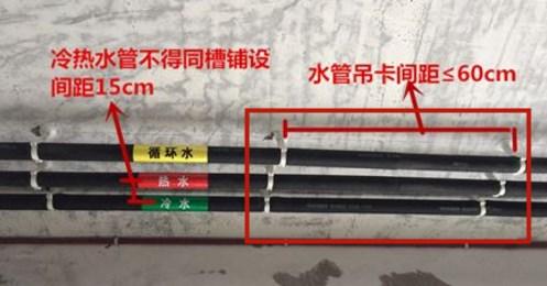 禁止水電管道同槽!至少熱水管表面的水汽會侵害電源!電管需遠離至少10cm,并盡量要在水管上方!