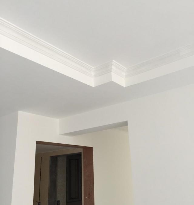 釘釘子之后,最后是收邊,把多余的快粘粉清理干凈,基本上石膏線就安裝成功了。