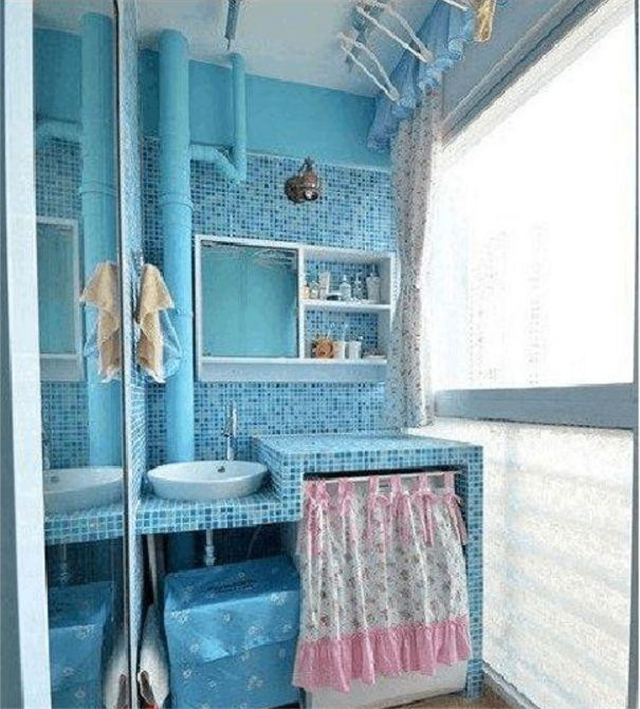 當(dāng)然也可以完全裸露,像上圖一樣,藍(lán)色的瓷磚搭配,后期用藍(lán)色油漆涂刷管道,一體顏色,裸露也是可以的