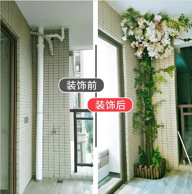 如果陽(yáng)臺(tái)是木質(zhì)吊頂,比如桑拿板或者綠可木或者防腐木,都可以在吊頂?shù)臅r(shí)候,用木頭把管道包住,這樣也能統(tǒng)一,也是最簡(jiǎn)便的裝飾方法