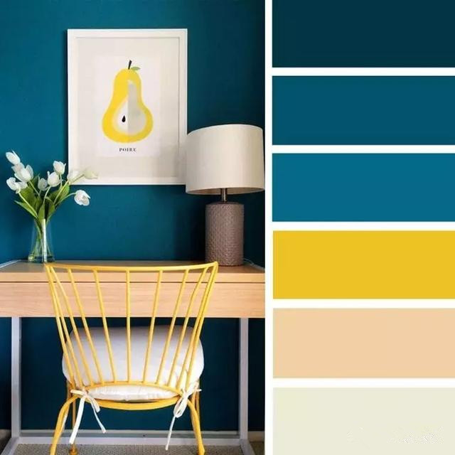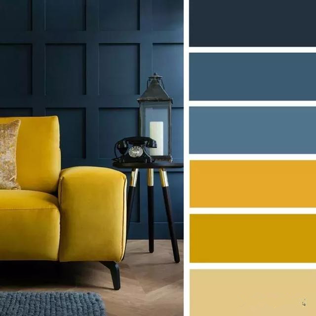 藍色是黃色的對比色,可以說是最佳搭檔。冷暖色調(diào)的彼此可以相互輝映,讓空間的質(zhì)感提升不少。如果選擇了深邃的多種藍色做為墻體、窗簾、抱枕的話,那么不妨選擇黃色的沙發(fā)、地毯、椅子加以點綴,能為本來陰郁安靜的氛圍增添更多活力。