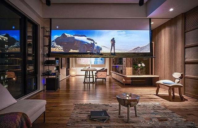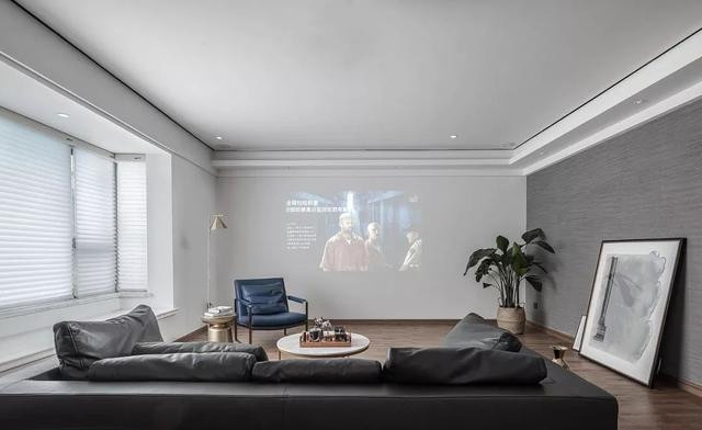 ▲ 這款案例是極簡的效果,直接選擇放棄投影幕布,直接讓影像投射到了墻面上。不過,看過投射在墻面的朋友都知道,墻面涂刷得再好,視覺效果和專業(yè)的幕布還是沒法比的。