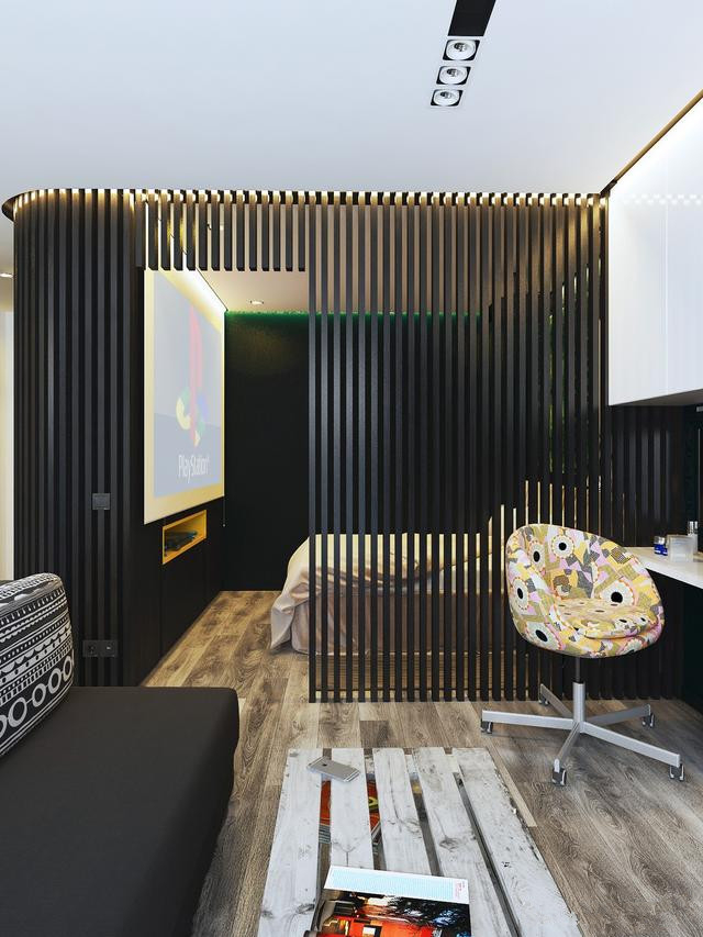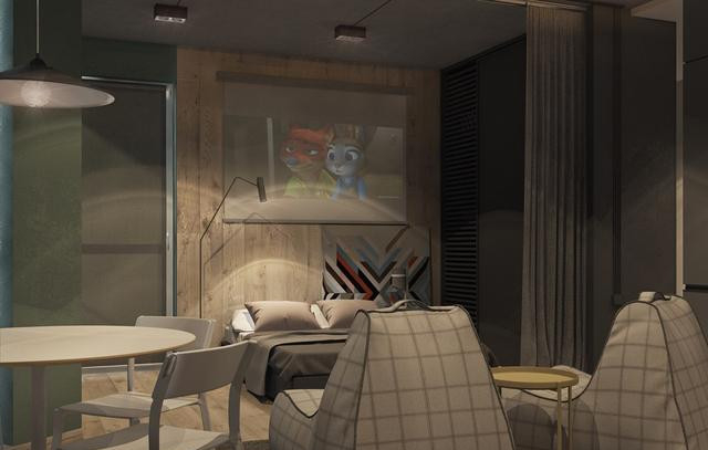 ▲ 當(dāng)然,如果你實在覺得墻面的確沒有地方可以懸掛投影幕布了,那么可以考慮一下直接投射到天花板上。不過秀巢網(wǎng)小編需要提示的是,這種情況一定要提前想好天花板主燈的位置,否則將來影像的位置有一盞燈的話,就比較影響觀看效果了。
