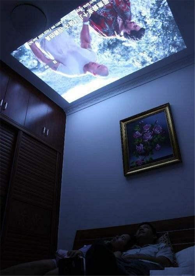 把投影幕布安裝在臥室也是非常普遍的,最大的好處是可以躺在床上盡情地看大片,試想一下:晚上和愛人擁抱在一起看著喜歡的片子,是不是也是一種小確幸呢?