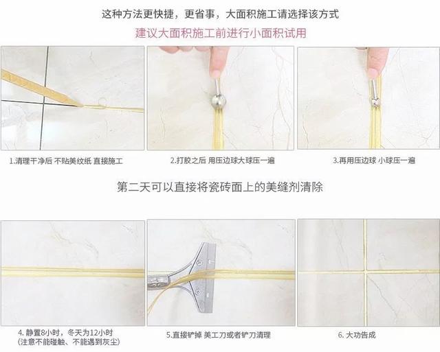 打完美縫劑立刻壓縫,容易導致美縫劑沒有完全填滿縫隙。一般停留5分鐘再壓,效果最好,遇到交叉拐角可以多壓幾次,壓縫的時機特別關鍵。