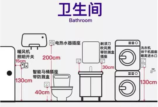 別以為衛生間經常有水就以為自己不會用很多電器,除了吹風筒、電熱水器,還有智能馬桶、電動牙刷、電動剃須刀等等都需要插座,所以多準備幾個總是不會錯的,記得都要用防濺插座哦。