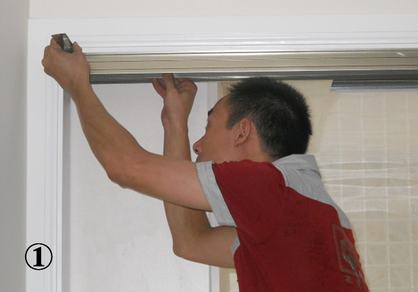 2、用軟尺測量即可在中間用標記筆標記;然后用上軌道比劃,劃出需要用螺絲固定的孔然后鉆孔,先固定兩邊,再固定中間部位,即完成上軌道的安裝。