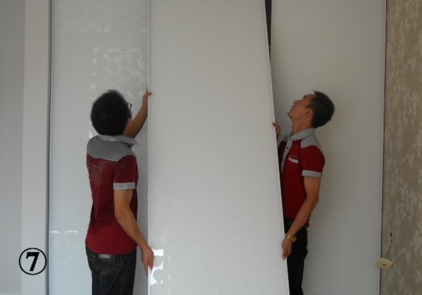 7、開始移門安裝。將門輕輕抬起來讓門的上滑輪順利進入上軌道里面,左手用力抬住移門,右手按住下滑輪,讓下滑輪可以很順利進入下軌道。