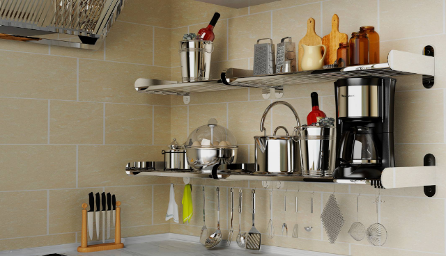 搭配:一般選擇掛壁式置物架,能很好的利用空間,并且增加廚房的金屬感。性價比:中等