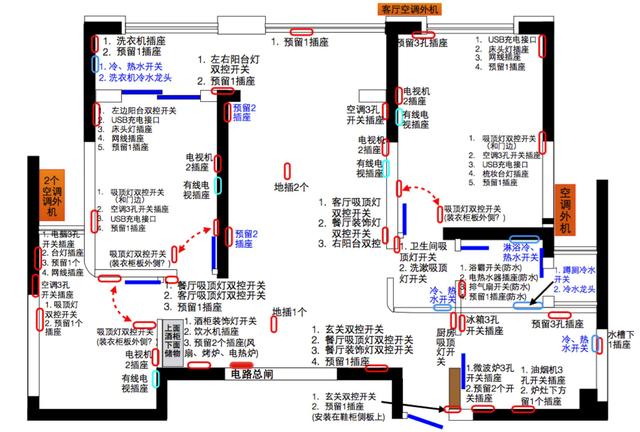 首先,來看看全屋的開關插座布局,接下來我們再詳細說各個區域。