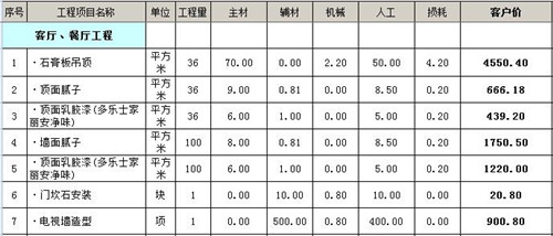 在這兩個區域中,會產生的收費項目有:石膏板吊頂、頂面膩子、頂面乳膠漆、墻面膩子、墻面乳膠漆、門檻石安裝、以及電視背景墻的造型設計。價格如下表:
