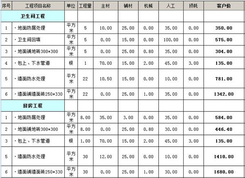 在裝修廚房時,產生的收費項目有:地面防漏處理、地磚、包上下水管道、墻面防水處理、以及墻磚;裝修衛生間時,產生的收費項目有:地面防漏處理、衛生間回填、地磚、包上下水管道、墻面防水處理、墻磚。價格如下表: