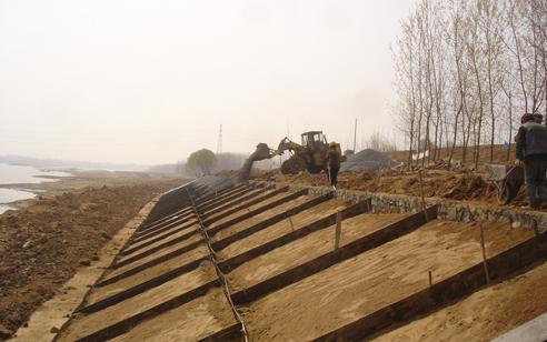 2.放樣與施工:在相隔50~100米之間放臨時水準柱,將此看成放樣的證據。位于堤壩防橫斷面的位置,相隔20~30米之間按照護坡的規劃進行高度的及坡面樁排成一排,同時按照坡面的長度在每一排打上3到5個樁,施工流程為自上到下。