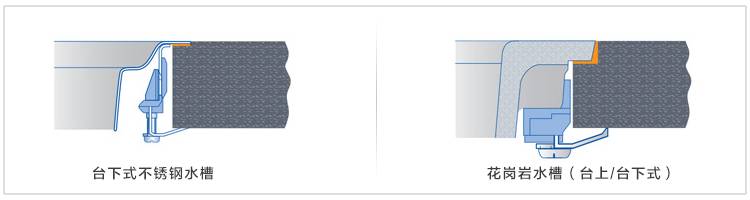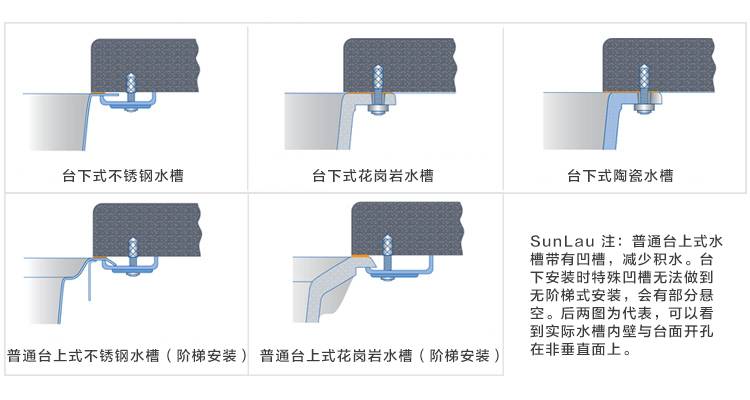 臺下式安裝目前用的也很多,尤其是選擇手工不銹鋼水槽的話,基本上是默認安裝方式。不過國內的安裝方式有兩種,一種是臺下無階梯式安裝,一種是階梯式安裝。