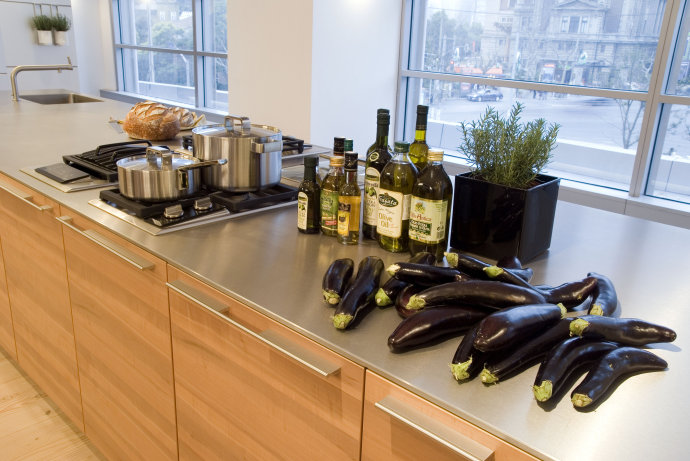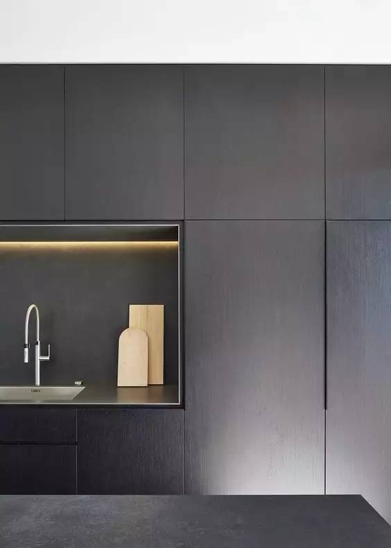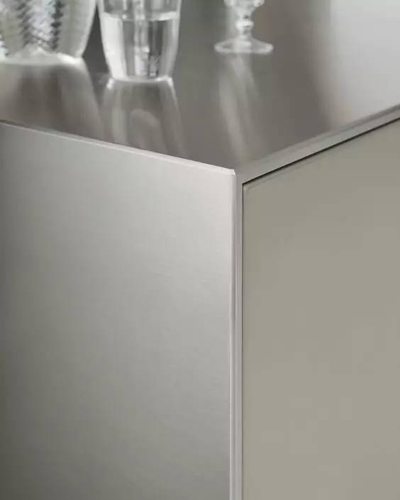 不過整版不銹鋼臺面就是另一回事,歐洲很多品牌都可以提供,一般是 10~15mm 厚不銹鋼板,有拉絲和磨砂表面。邊角都是精心倒角打磨的,搭配簡潔的柜體,那種犀利感,懸浮感,讓人愛不釋手。水槽則可以一體化焊接,當然工藝也是棒棒噠,質感可以高度統一,視覺上賞心悅目。但是價格是個坎兒,目前除了我知道的幾個進口品牌櫥柜做的跟藝術品似的,國內供應商我還在尋覓。