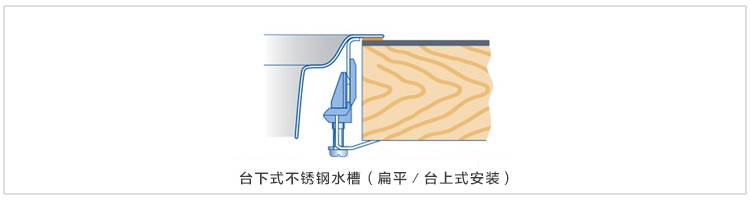 優點 相較普通臺上式安裝,水槽邊翼薄僅高于臺面 1~2mm 左右,便于清潔臺面,介于臺上和臺下之間,無需收費,安裝簡便。