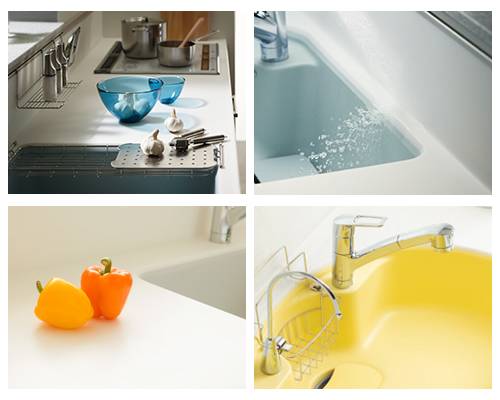人造石類一體化臺面,顏色、紋理選擇較多,最多可達 100 多種,尤其是倒角、排水口、整體造型都可以有很多種類。較不銹鋼加工定制容易。