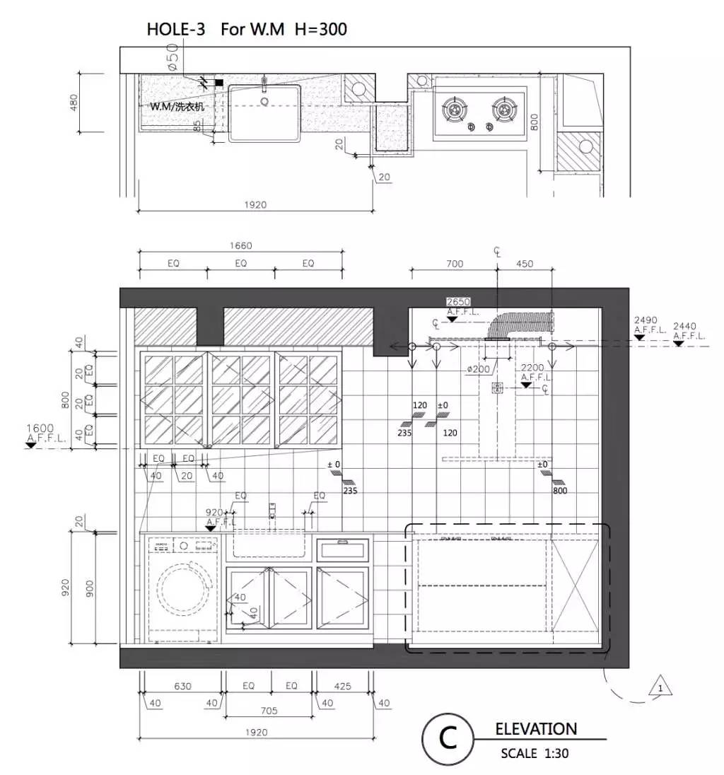 嵌入式安裝比較雜亂,一般指水槽與臺面接觸,不在一個平面,高于臺面的類型可以一定程度滿足臺面高差的需求,比如水槽高度較高減少彎腰角度。臺面不遮蓋或部分遮蓋水槽,多見于陶瓷水槽,北美、歐洲傳統風格的廚房較多使用。我在幾年前用過一次,全淘寶找了兩天就一家,只因客戶的洗衣間想要陶瓷嵌入式水槽(附上一張局部圖紙),種類很多具體見配圖。