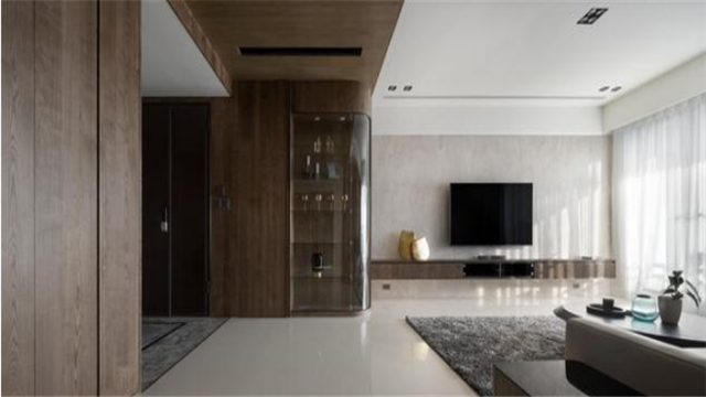 客廳,采以淺米黃大理石鋪敘電視墻,并于全室妝點自然木紋,營造大器溫馨的質感。