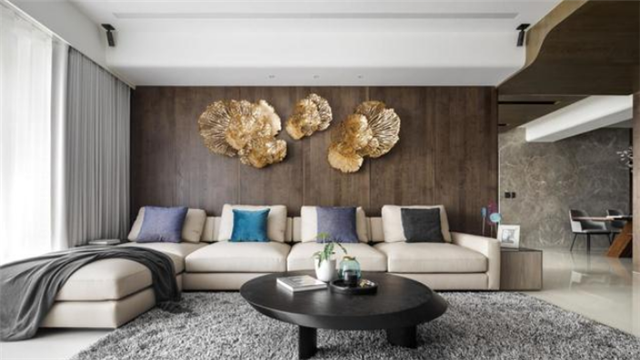 沙發(fā)背景墻更巧妙給予金色飾品妝點,形成低調奢華的視覺主題,創(chuàng)造華美現(xiàn)代底蘊,針對天花板的大梁問題,則透過木質調的延伸包覆、緩解壓迫存在感。