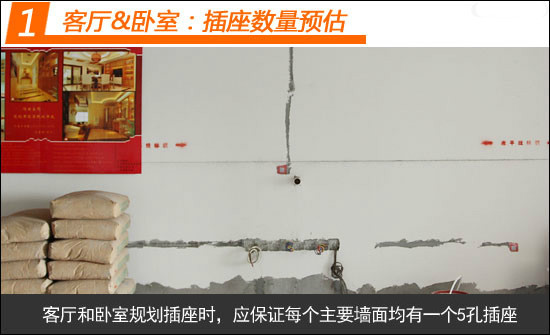 如果墻面長度超過3.6m應適當增加插座數量。墻面長度小于3.6m,插座可安置在墻面的中間位置。設置電視出線插座的墻面(此墻面為電器擺放集中之處)應至少設置兩個5孔插座,其中一個插座應與電視出線插座相靠近并與之保持0.5m以上距離。