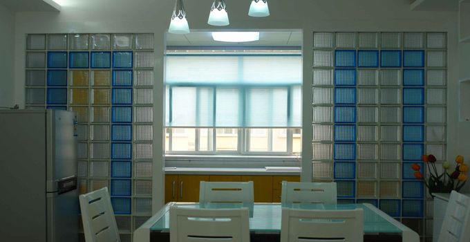 玻璃磚隔墻無論運用在廚房、客廳、餐廳、浴室還是衛生間中,都能起到分割大空間的同時又保持大空間的完整性,同時玻璃自身透明晶瑩的特質又能給建筑帶來夏日的清爽和清新感,增加光亮度和通透感。