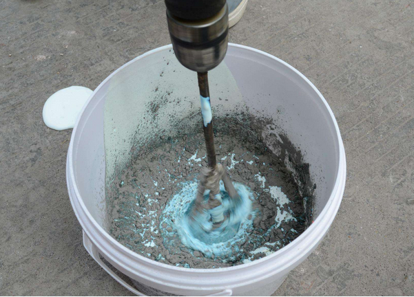 先做地面的防水,所以先將地面防水涂料調配好。按一定的比例把防水涂料倒進塑料桶里,先倒入涂料乳液,然后再倒入粉料,用攪拌器將兩者攪拌均勻,呈無顆粒狀態(tài)后靜置三分鐘,消除小氣泡后即可使用。