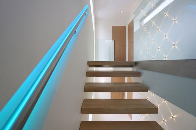 另一個很酷的概念是帶有內置照明的樓梯扶手。一個很好的例子是hamhuis architecten 與EeStairs合作 為荷蘭的一個家庭住宅設計的樓梯 。其扶手整齊地插入墻內的凹室中,藍色燈光照明使其外觀非常酷,而且在晚上非常有用。