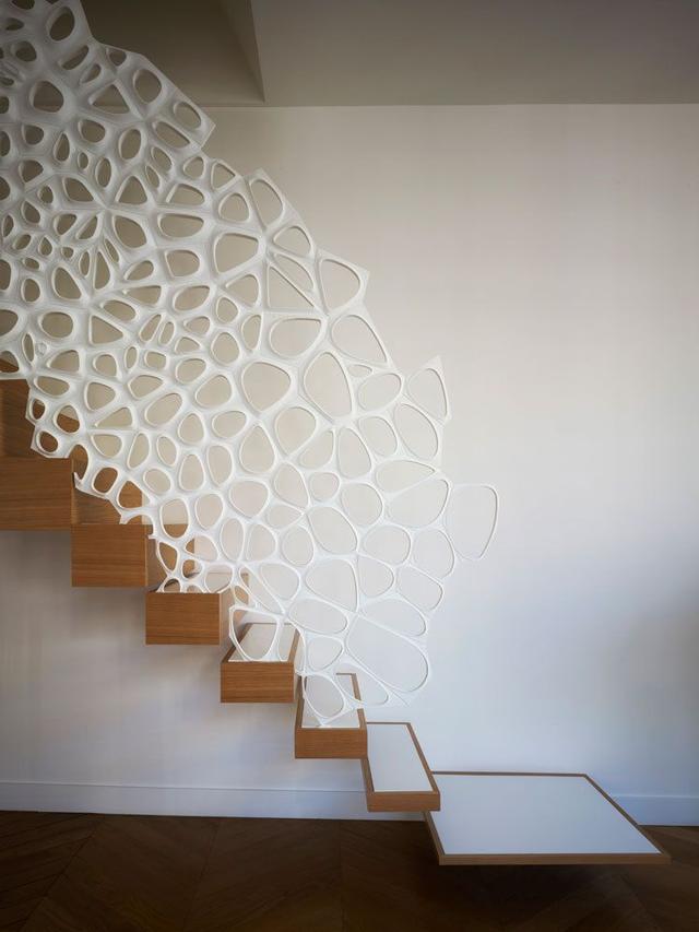 一個更有雕塑感和引人注目的扶手、護欄設計,比如這一個,絕對可以從實際樓梯偷去你所有的注意力。如果你的目標是讓樓梯盡可能的簡單和最小化,這實際上是一個很好的策略。這個特別的設計是設計師Marc Fornes /THEVERYMANY的作品。