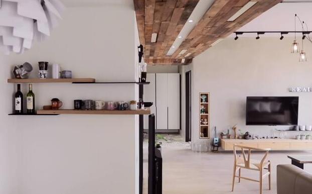 因為入門玄關的屋頂有難看的大梁,為了彌補這個缺陷,設計師采用原木板材鋪設,加上明亮的燈光效果,即解決了有大梁的缺陷,又讓人感覺到最自然的森林氣息。