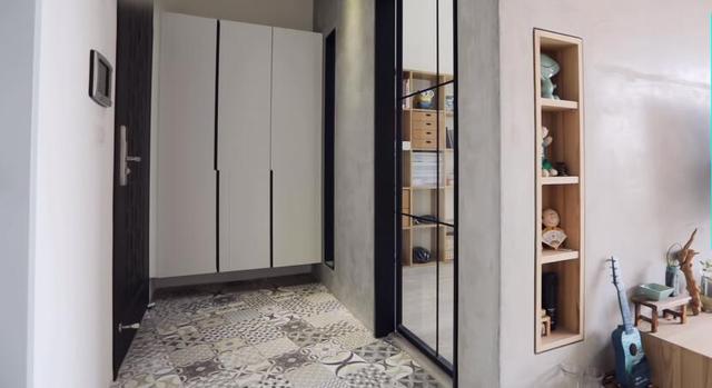 玄關的瓷磚是設計師突發其想,不過屋主父親開始的時候并不同意,后來在于屋主與他的父親再次商議后決定了下來,裝上后效果出其的好,瓷磚的花型讓玄關空間生動起來。
