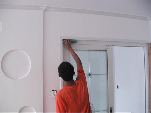推拉門的門扇和滑輪系統通常都是在工廠內直接加工成型的,在上滑道安裝結束后,就可以將滑輪放入滑槽內,然后再通過人工或其它吊裝工具將豎直的放在其下方,同時將門扇上面的螺桿套入安裝入滑輪上的螺栓孔內,將其固定。