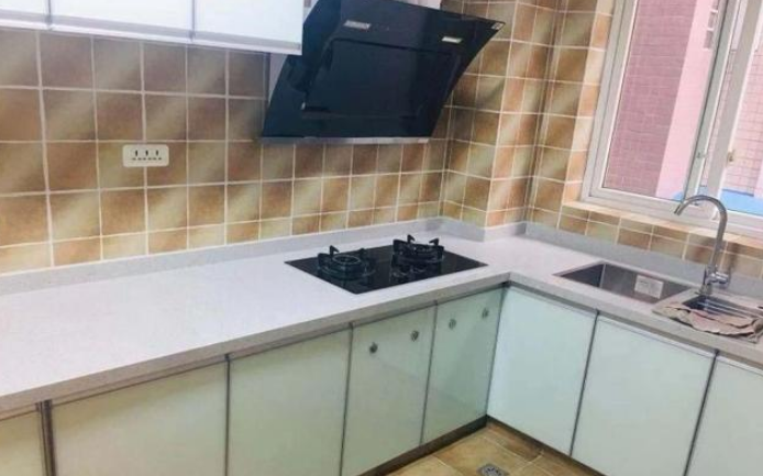 餐廳進門就是廚房,櫥柜不是什么大牌子,只是直接在城里找的一家做櫥柜的給定制的,白色的臺面配淺綠色的柜子,清新自然。