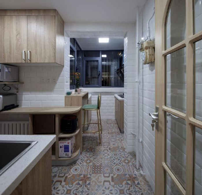 廚房連同陽臺都打通了,地面都是貼的美式的小花磚,櫥柜都是定制的原木的,儲物空間大,還有休閑的情調吧臺,表哥自己住著別提多高興了。