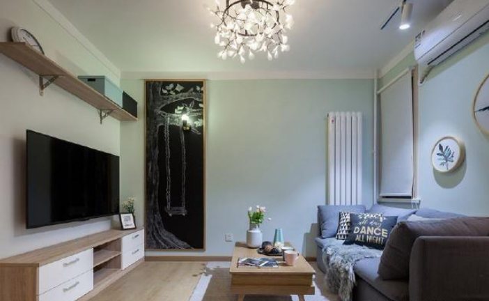 客廳看著還是很溫馨的,墻面刷成了藍綠色,布藝沙發得顏色很復古,看著就很雅致舒適。電視墻也是空白一片,只是在頂面裝了一張隔板,能裝飾又能置物。