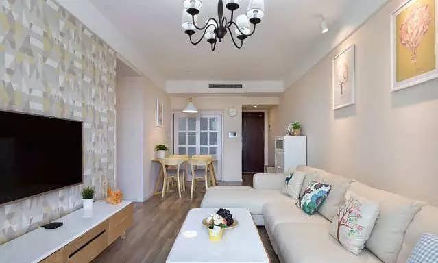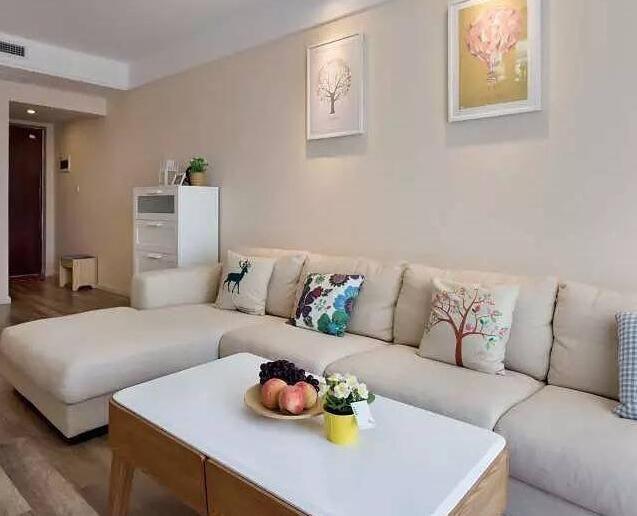 擺上一套和墻漆顏色非常接近的布藝沙發,看起來輕松和諧,中間的木質茶幾不是笨重的,四個桌角可以省地方。