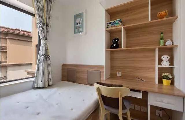 臥室,定制了一套木質家具,大床對面的小過道擺放一張梳妝臺剛剛好,墻漆的顏色很簡單,但挺清新,顏值高。
