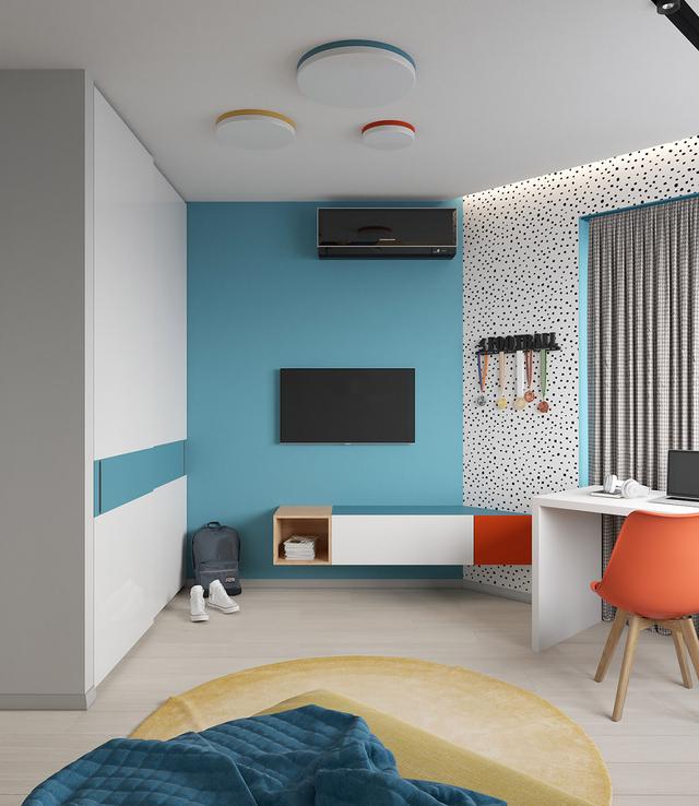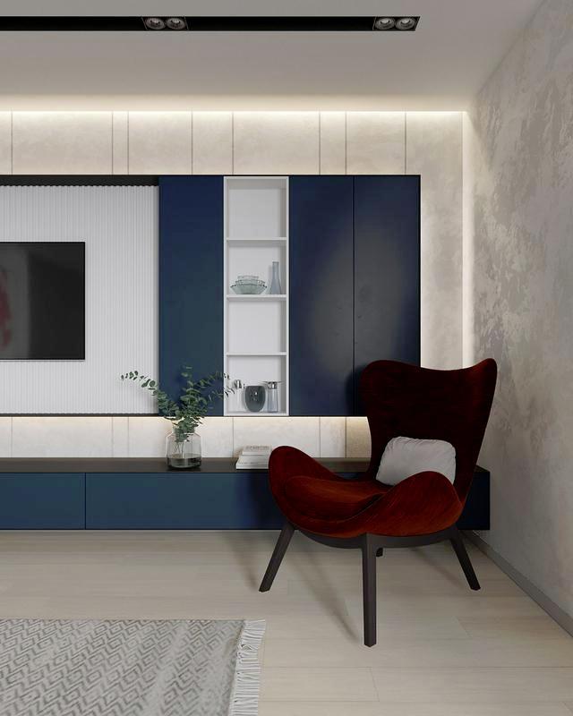 房間里的主角之一是一把深紅色的椅子,藍(lán)色電視墻的襯托下,給生活提供了一個時尚的休閑場所。平板電視漂浮在白色面板的中央,與房間的白色墻壁相呼應(yīng)。