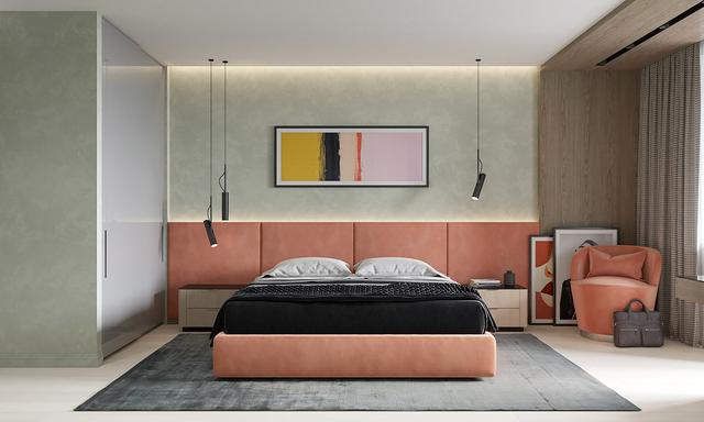 在現(xiàn)代化的臥室里,有一個桃紅色的配色方案。桃紅色的織物床架和超大的床頭板主導(dǎo)了房間,與現(xiàn)代墻壁藝術(shù)的色調(diào)相匹配。細(xì)長黑色的臥室吊燈,黑色和灰色的床上用品都有助于平衡整個臥室的整體色調(diào)。
