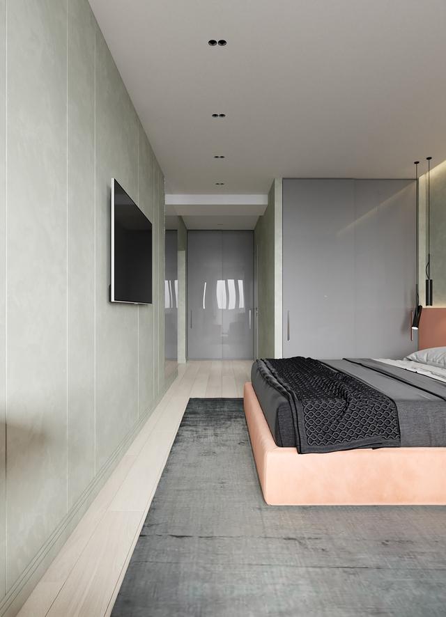 淺色的木地板部分被大面積的灰色地毯覆蓋,與灰色的壁櫥門相協(xié)調(diào)。