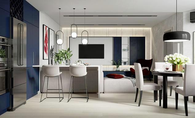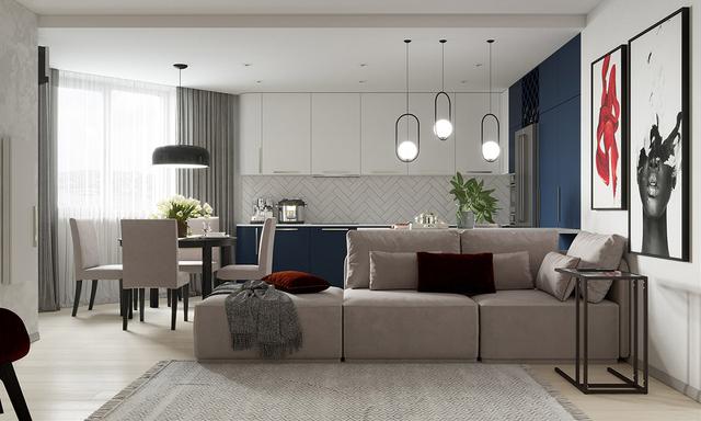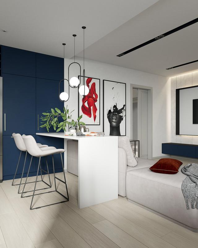 活躍的生活空間以豐富的藍(lán)色和紅色的色彩圖案為主。房間的裝飾主要是白色,深藍(lán)色的開放式廚房和電視背景墻,整體只有一副紅色壁畫點綴。