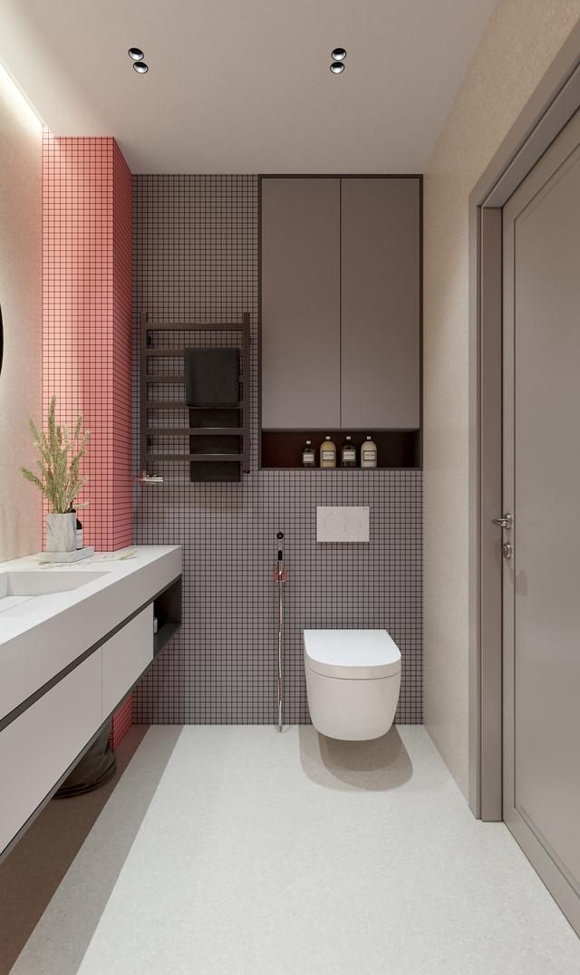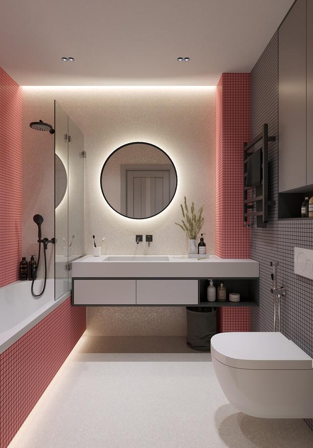 在主浴室,采用了珊瑚色和灰色兩種色調(diào)。