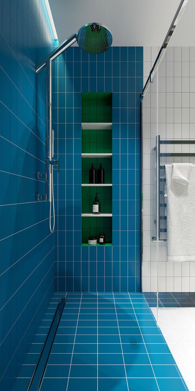 淋浴室內(nèi)的一個嵌入式儲藏角落覆蓋著綠色瓷磚,而藍(lán)色瓷磚則覆蓋了淋浴房的其余部分。白色的置物架穿透了色彩,讓人耳目一新。