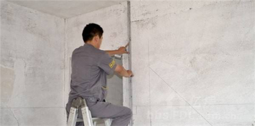 步驟3.吊桿安裝好后,則需要安裝龍骨,為了整體的穩(wěn)定性,先安裝邊龍骨,根據(jù)之前彈好的水平線,用釘槍將龍骨固定在墻體上。