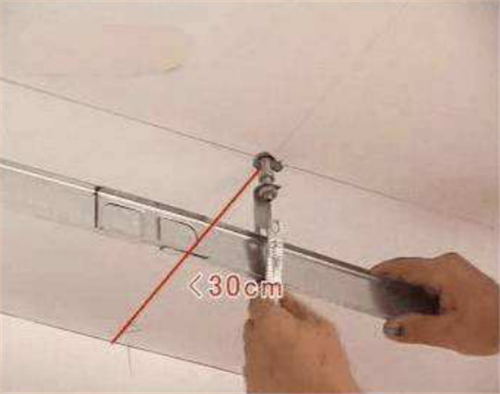 步驟4.主龍骨是主要受力點,安裝時,和房間長度持平。按照圖紙的天花吊頂設(shè)計,將龍骨安裝在相對的吊桿下,調(diào)整角度和高度,水平后,則可以擰好膨脹螺栓。